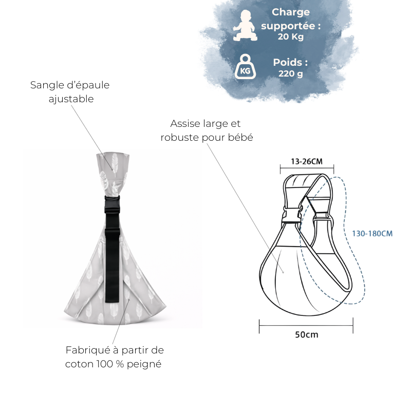 L’écharpe est conçue pour s’adapter à différentes morphologies et répartir le poids de manière équilibrée, afin d’améliorer le confort du porteur.