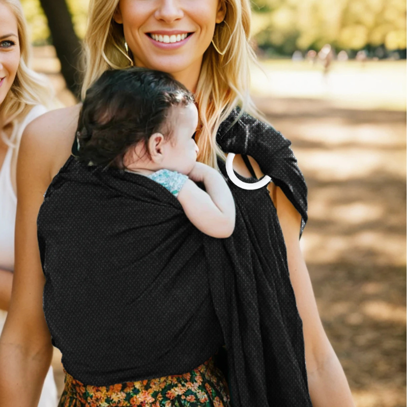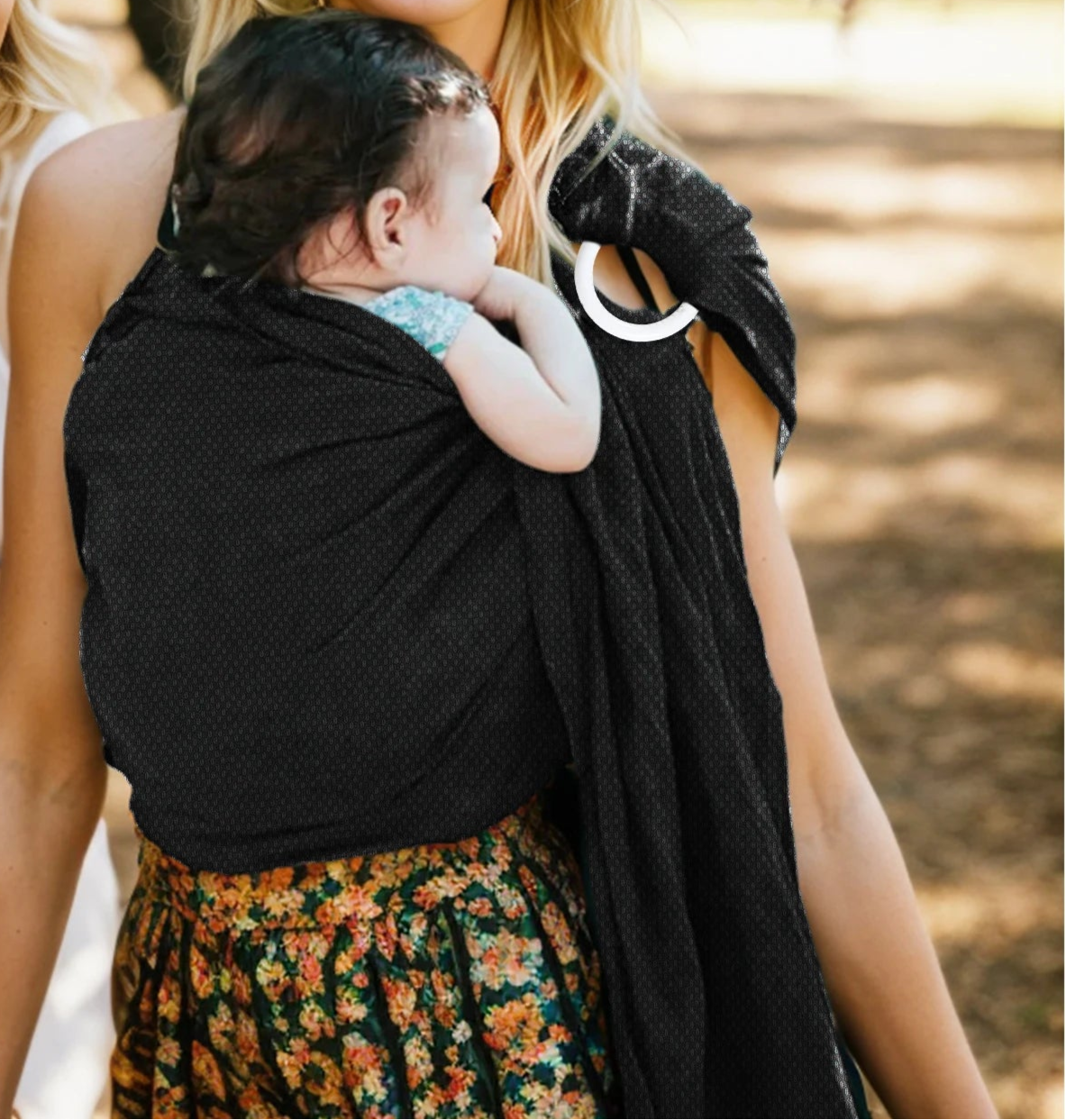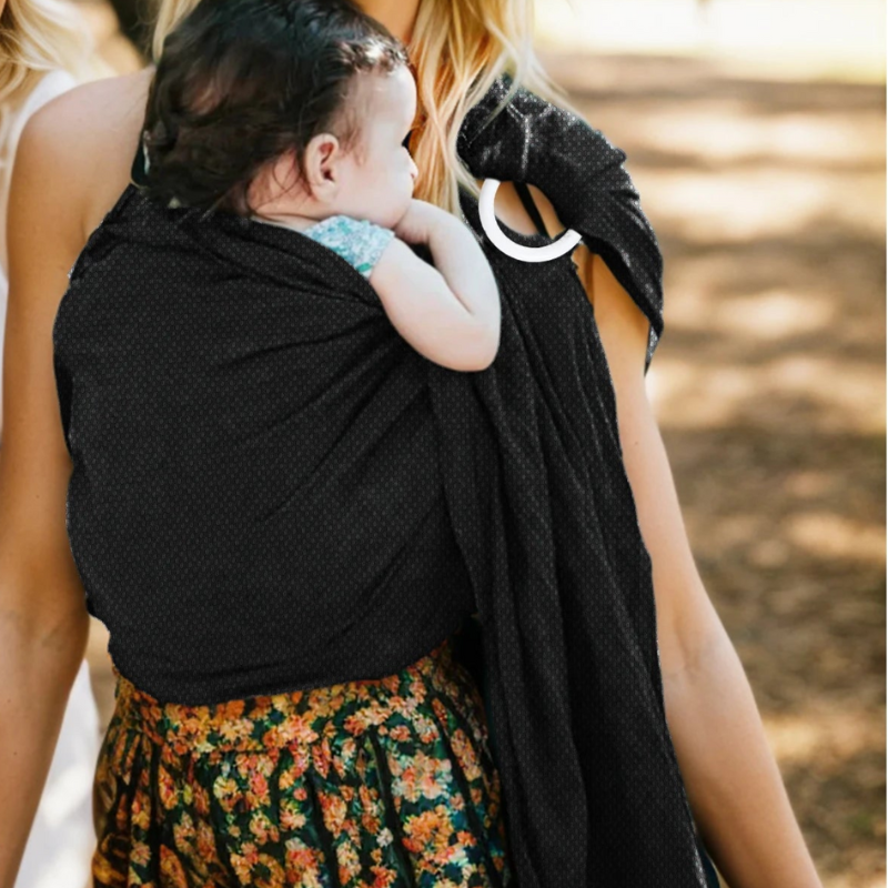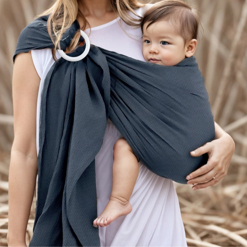 L’écharpe de portage à anneaux ajustables se met en place en quelques secondes : il suffit de glisser le tissu et de serrer pour adapter la tension à votre morphologie.