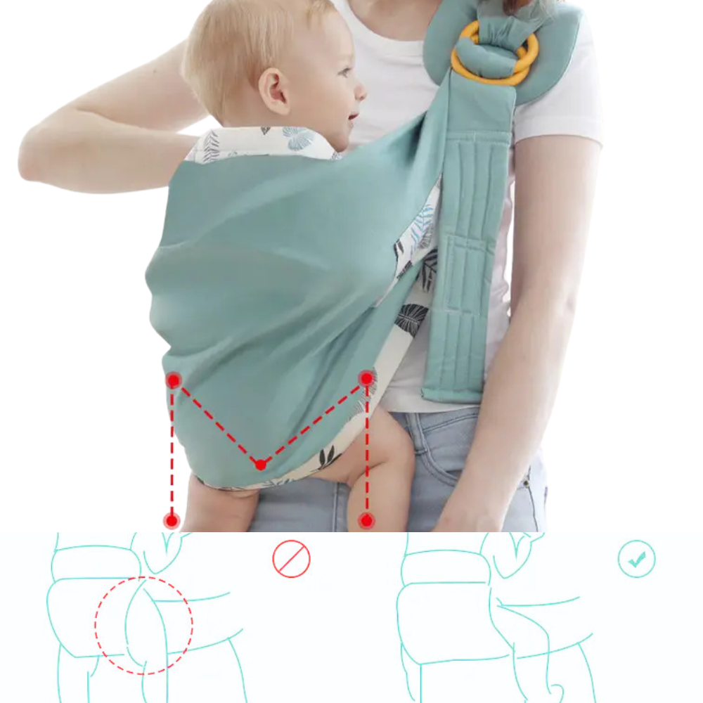 Les anneaux solides ajustent la tension en un geste pour installer bébé en position physiologique (dos en C, hanches soutenues).