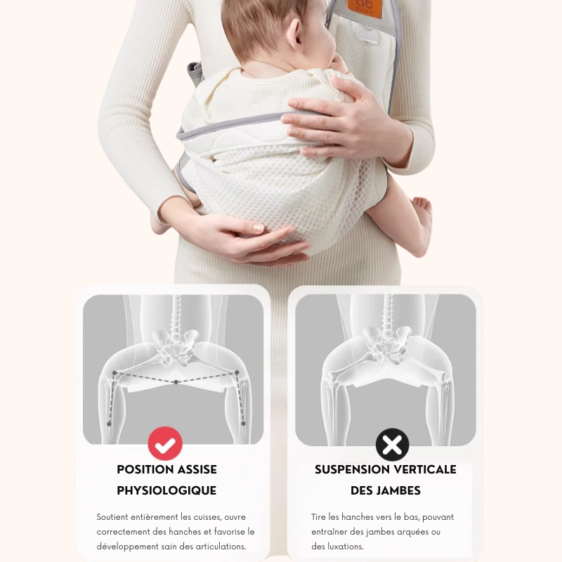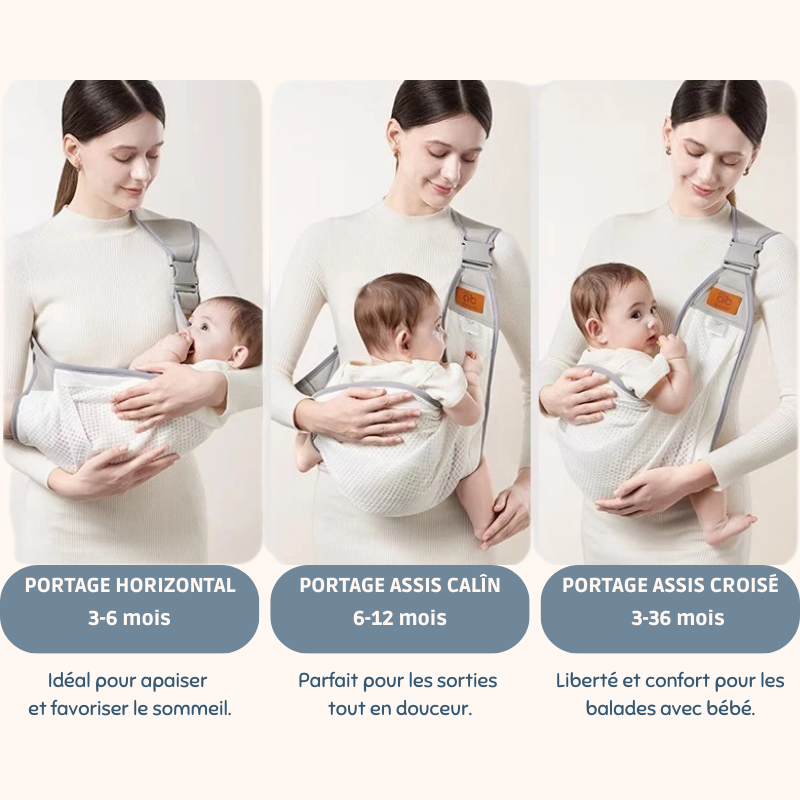 3 modes évolutifs : berceau pour l’allaitement (3–6 mois), face-parent confort (6–12 mois) puis assise latérale (jusqu’à 36 mois selon l’enfant).