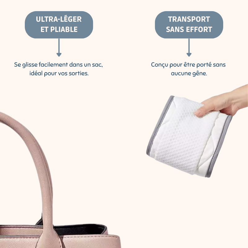 Ici, pas de nouages interminables : les réglages sont intuitifs et se font seule en quelques gestes. L’écharpe est ultra-légère, pliable, se glisse dans le sac et se lave en machine.
