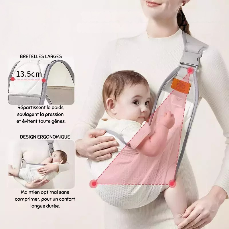 La force de ce modèle, c’est sa répartition du poids : la bretelle extra-large répartit la charge sur l’épaule et le buste, tandis que le hamac maintient le bas du dos de bébé en douceur.