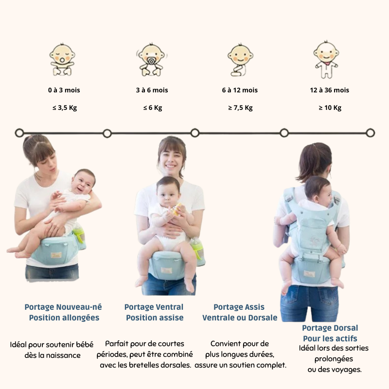 Polyvalent, il s’adapte à chaque âge et moment : ventral face au porteur, face au monde quand bébé grandit, latéral pour apaiser, dorsal pour les longues sorties, ou siège seul pour les pauses rapides.