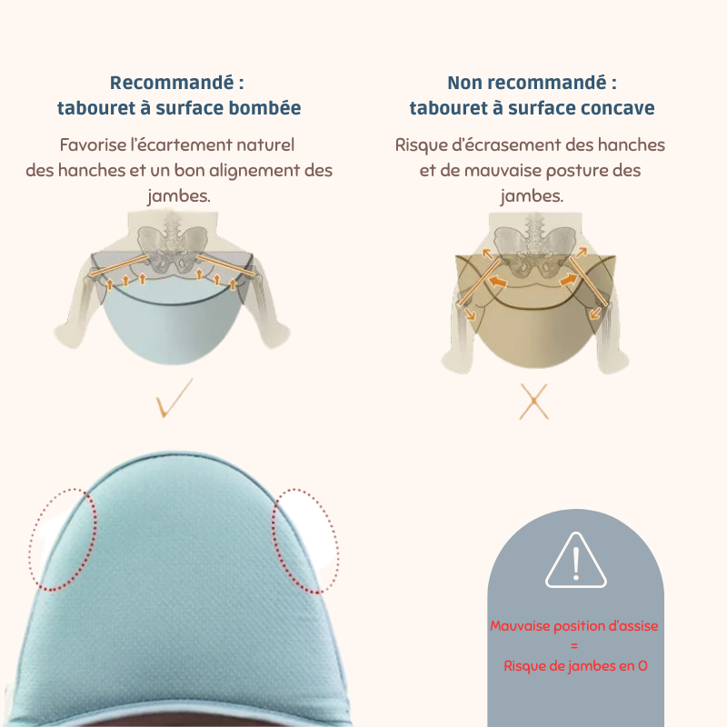 Un porte-bébé ergonomique maintient le bébé dans une position physiologique en “M” (genoux relevés, dos arrondi), respectant ainsi sa posture naturelle.