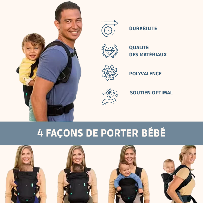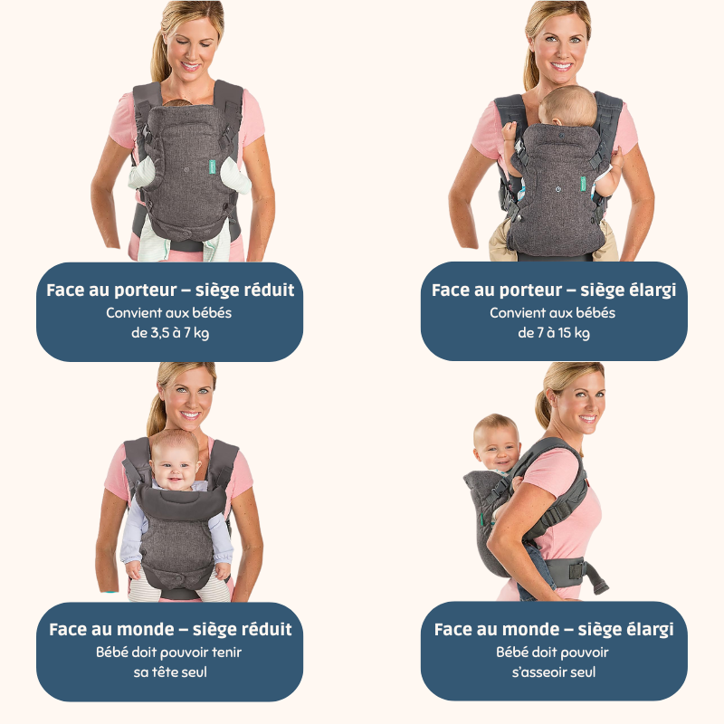 - Façon de porter : Transport avant, Face avant, Face-à-face, Porte-bébé dorsal