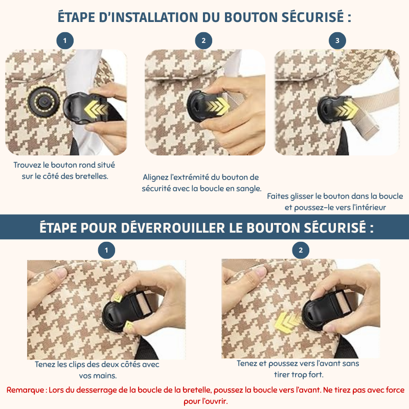Les sangles se verrouillent avec un bouton sécurisé facile à utiliser par le parent, impossible à ouvrir par bébé.