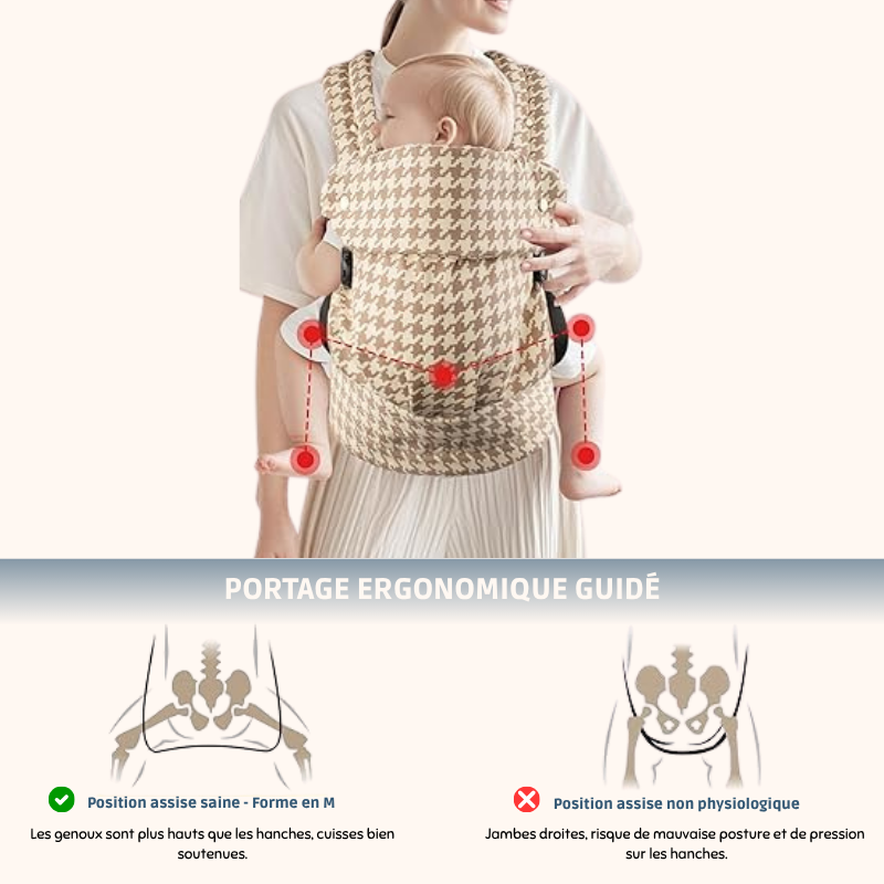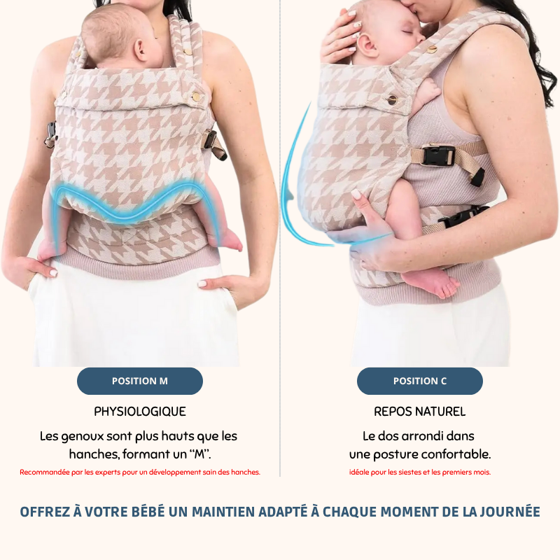 Un porte-bébé ergonomique maintient le bébé dans une position physiologique en “M” (genoux relevés, dos arrondi), respectant ainsi sa posture naturelle.