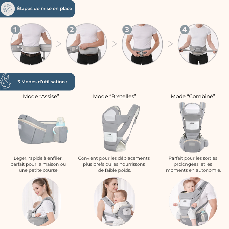 Le porte-bébé s’adapte à votre rythme avec 3 configurations pratiques :