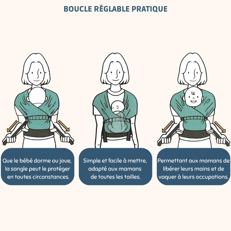 Pratique et unisexe, il convient à toutes les morphologies, se plie dans son pochon et vous suit partout — à la maison, en balade ou en voyage. Doux sur la peau, aéré pour l’été et facile à laver, c’est l’allié sûr et confortable qui donne envie de porter plus longtemps… et de profiter de chaque câlin.