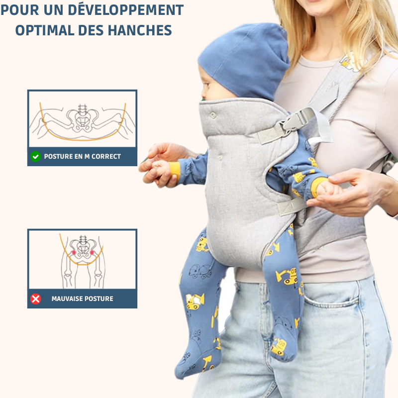 Un porte-bébé physiologique est conçu pour respecter la posture naturelle de l’enfant : dos arrondi, jambes relevées en “M”, hanches bien soutenues. C’est la position recommandée par les spécialistes pour un développement harmonieux.