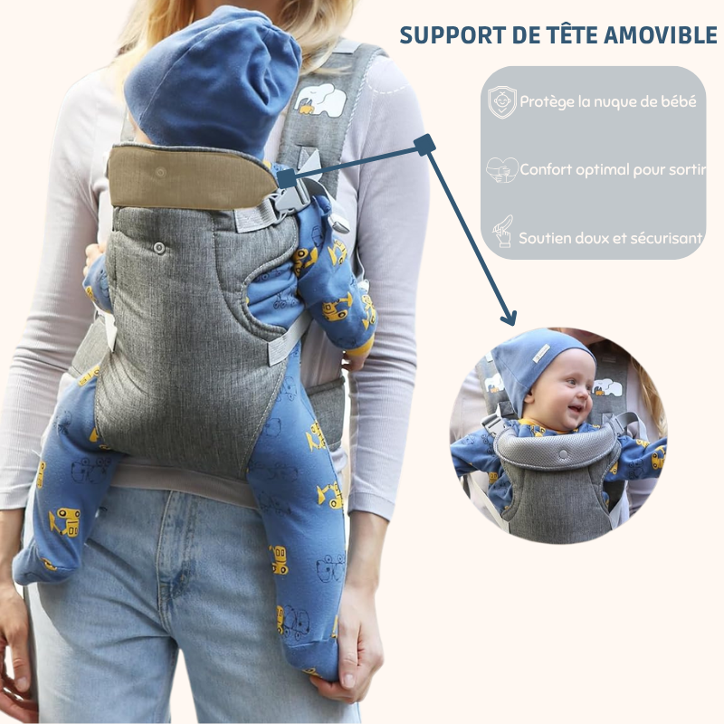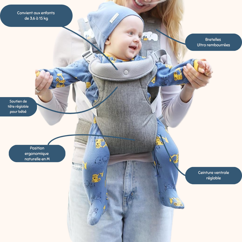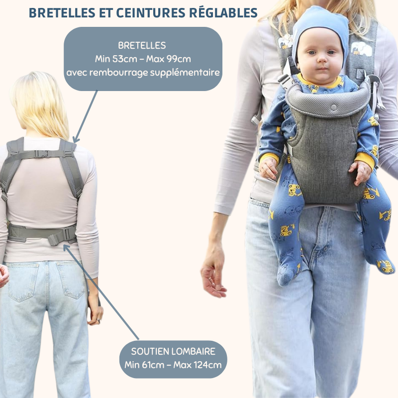 - Façon de porter : Transport avant, Face avant, Face-à-face, Porte-bébé dorsal
