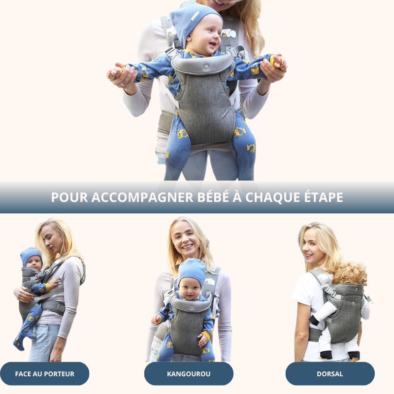 Trois modes de portage (face au porteur, kangourou, dorsal) vous offrent la liberté d’adapter la position à chaque étape de sa croissance.