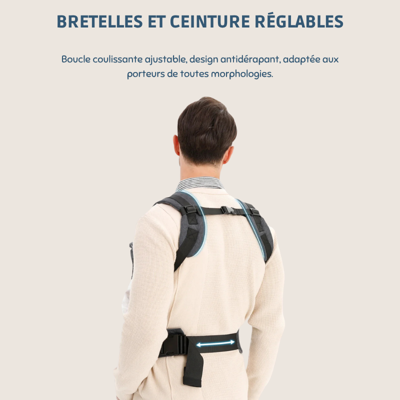 Les réglages progressifs s’adaptent à sa morphologie, et les boutons permettent de passer de “cocon” à “curieux” sans retirer le porte‑bébé.