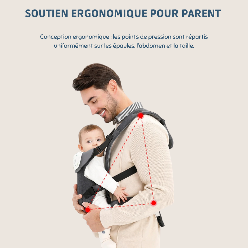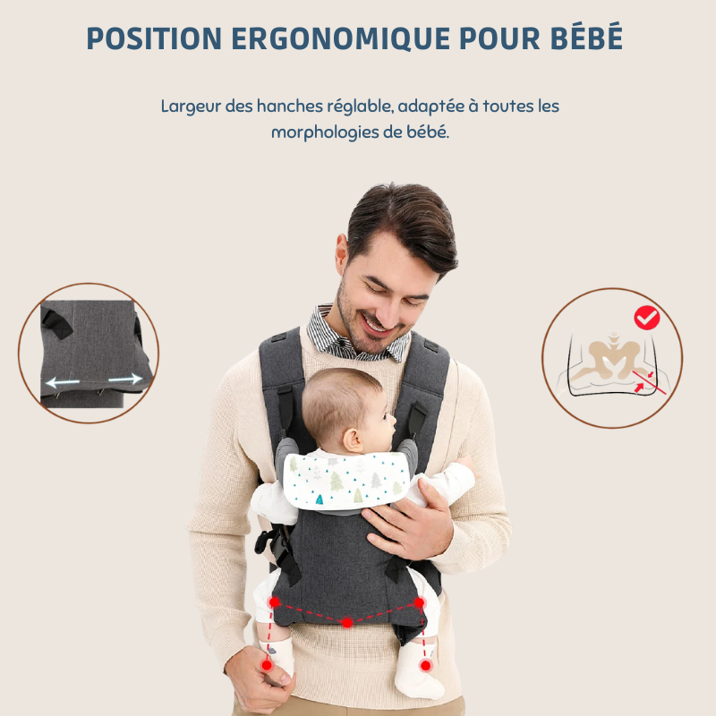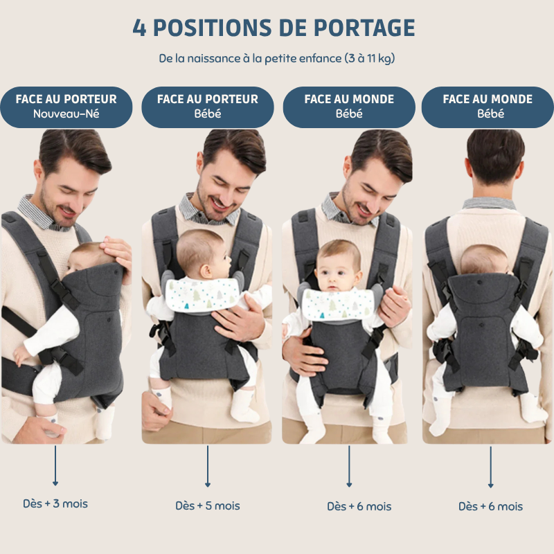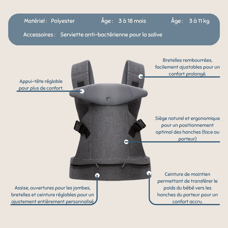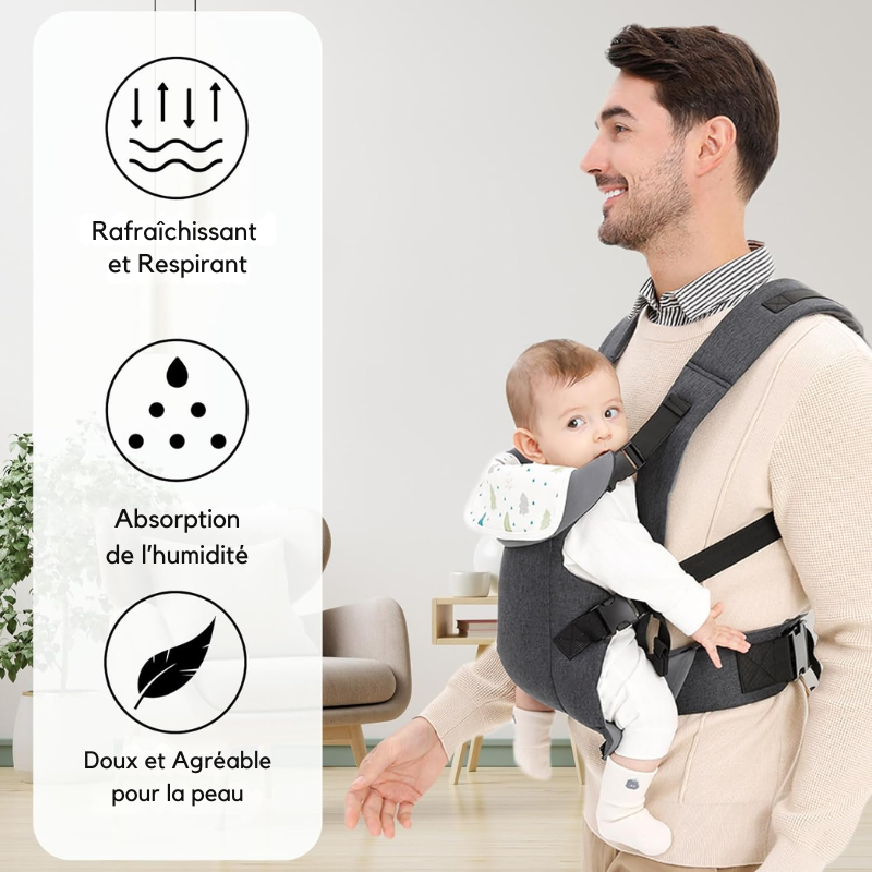- Façon de porter : Transport avant, Face avant, Face-à-face, Porte-bébé dorsal