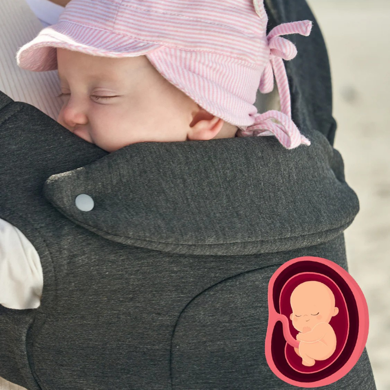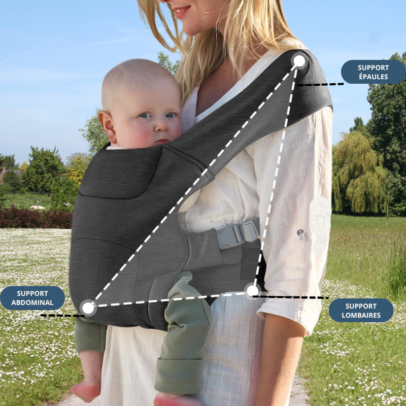 Un porte-bébé ergonomique soutient le bébé dans une position physiologique en “M” (genoux plus hauts que les fesses, dos arrondi), ce qui respecte son développement naturel. Contrairement aux modèles classiques, il évite la position suspendue qui peut être inconfortable ou nocive pour les hanches.