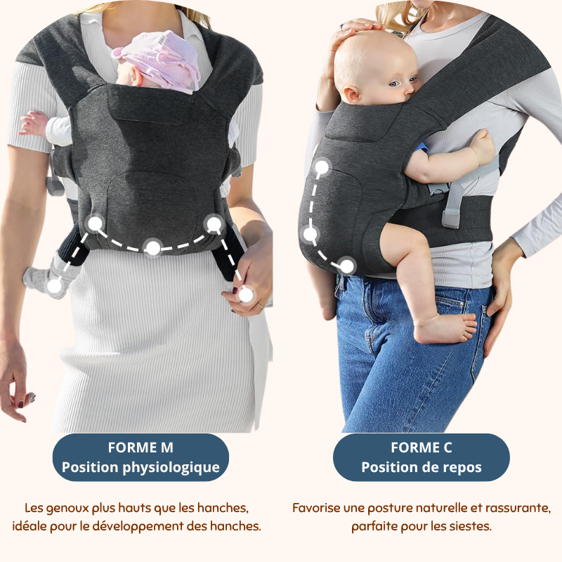 Le Porte-bébé Position C est conçu pour accompagner la posture naturelle des tout-petits, avec une assise ergonomique qui suit la courbure du dos et une position en “C” confortable.