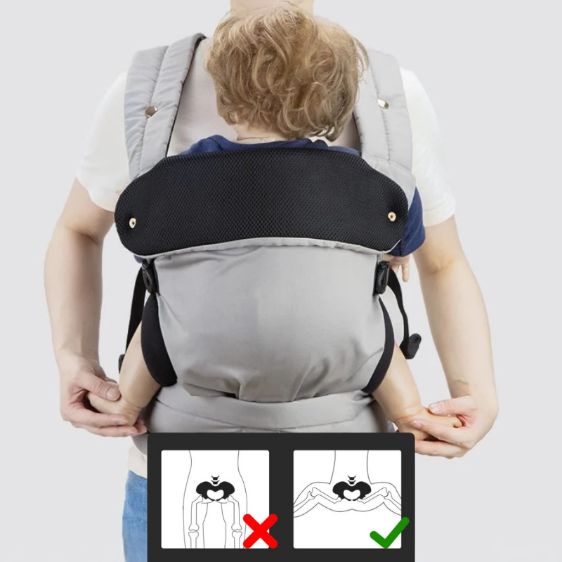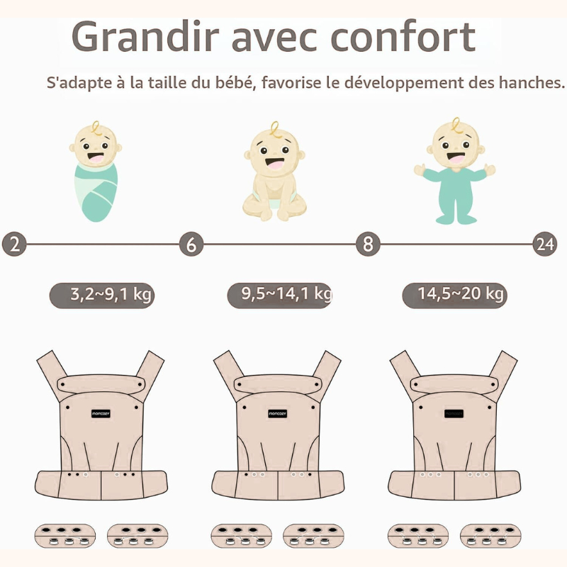 L’assise réglable par pressions évolue avec la croissance de bébé et aide à maintenir une posture naturelle en “M” (genoux plus hauts que les hanches). La structure répartit le poids selon un appui harmonieux épaules-abdomen-lombaires, pour un portage stable et agréable au quotidien.