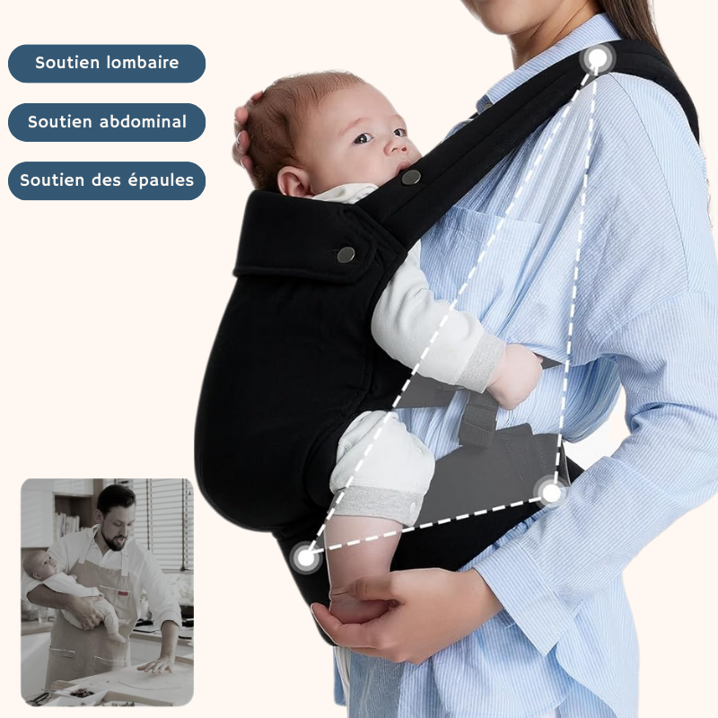 Vous gardez vos deux mains totalement libres, vous portez sans douleur même un enfant plus lourd, et bébé profite d’une vue dégagée sur son environnement. C’est une solution à la fois pratique et confortable pour les parents actifs.