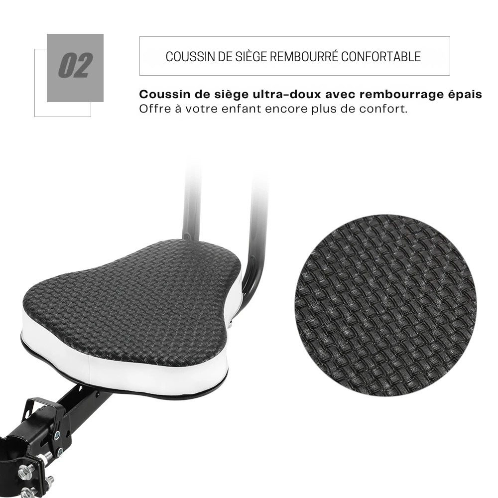 Grâce à ce porte-bébé avant, votre enfant peut voir le paysage, tenir son propre guidon, et partager avec vous chaque instant du trajet (Assise confortable, accoudoirs protégés en mousse, guidon à sa hauteur pour qu’il/elle participe vraiment)