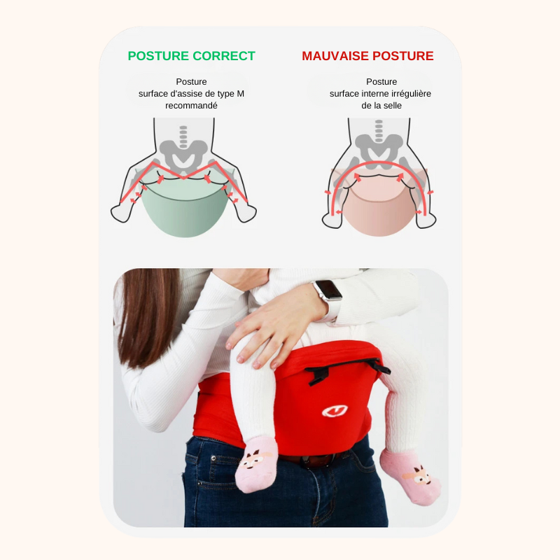 Un porte-bébé ergonomique maintient le bébé dans une position physiologique en “M” (genoux relevés, dos arrondi), respectant ainsi sa posture naturelle.